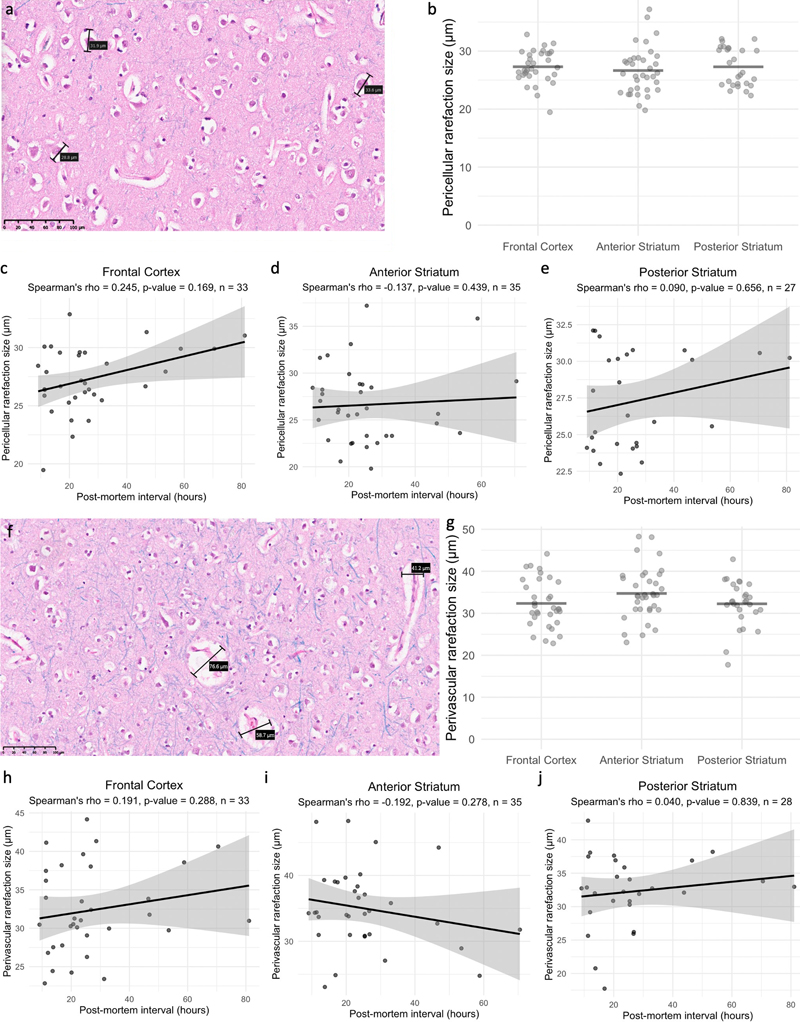 Figure 3. The sizes of pericellular and perivascular rarefaction areas are not significantly different across brain regions nor significantly correlated with the PMI. a: Representative image showing measurements of the three largest pericellular rarefaction areas in a region of interest. Scale bar: 100 μm. b: Distributions of the average sizes of pericellular rarefaction areas in each brain region. Horizontal lines represent arithmetic means. No significant differences were found across brain regions. c–e: Scatter plots showing the PMIs and average pericellular rarefaction size measured for each brain donor across the frontal cortex, anterior striatum, and posterior striatum, respectively. f: Representative image showing sizes of the three largest perivascular rarefaction areas in a region of interest. Scale bar: 100 μm. g: Distributions of average sizes of perivascular rarefaction areas within each brain region. Horizontal lines represent arithmetic means. No significant difference was found across brain regions. h–j: Scatter plots showing the PMIs and average sizes of perivascular rarefaction areas measured for each brain across the frontal cortex, anterior striatum, and posterior striatum, respectively. For all scatter plots, the black lines represent linear regression fits, with gray areas indicating 95 % confidence intervals. Spearman's rho and associated p values are shown for each brain region. 2D electron microscopy Using EM, we studied ten brain donors from the same brain bank (Table 1). We dissected fixed tissue from gray matter of the middle frontal gyrus, a part of the frontal cortex, and performed TEM on the embedded samples. The PMIs of the brains prior to immersion fixation ranged from 10.75 h to 27 h, with an arithmetic mean of 20.6 h. Qualitatively, the TEM images showed expected postmortem artifacts such as vacuolization and some areas with apparently decreased cytoplasmic contrast (Figure 4). However, the images showed that cell membrane contours were largely discernible and maintained much of their expected morphology, despite some potential postmortem alterations. Synapses and mitochondria could be identified in at least one image from all ten samples studied. Notably, the duration of refrigerated fluid preservation prior to sample processing ranged from 0.1 to 3.4 years, with no apparent differences depending on this variable.