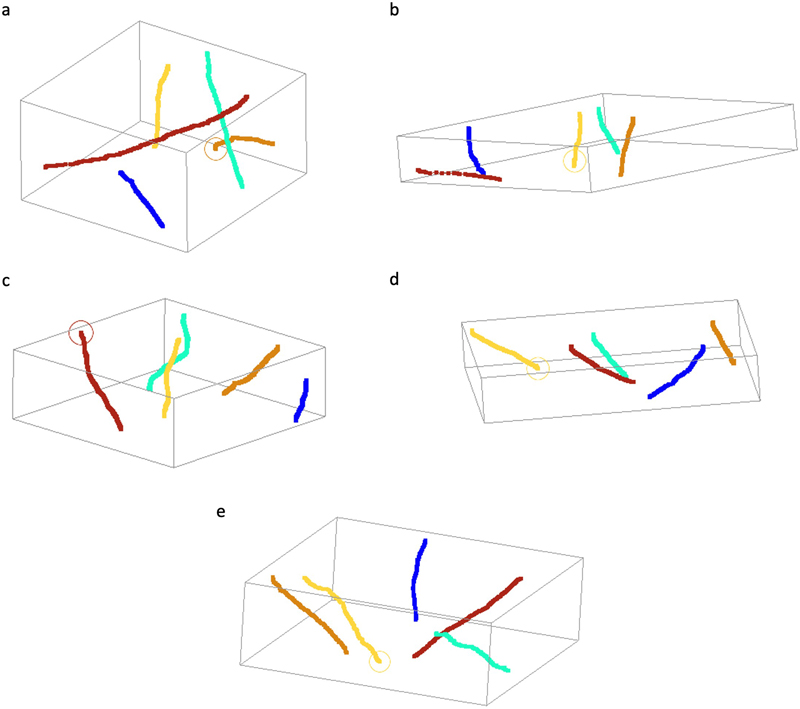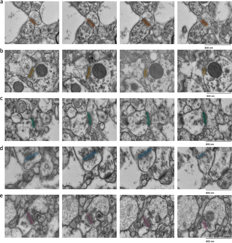 Figure 6. Representative images showing synapses that are traceable in ssTEM images. All synapses are all fully encapsulated in the set of four images. The samples are from donor numbers 36 (a, b) and 233 (c, d, e). Scale bars: 800 nm. To measure the traceability of neural structures over longer distances, we next performed SBF-SEM on two samples (samples 57 and 100, with PMIs of 25 h and 10.75 h respectively). We tested the degree to which myelinated axons could be traced across the available volumes (Figure 7). We found that all 25 myelinated axons that we attempted to trace were easily traceable (Figure 8). Overall, these findings suggest that the 3D structural integrity of myelinated axons is maintained in these immersion-fixed tissue samples, allowing for reliable tracing.