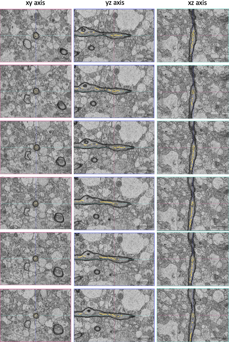 Figure 7. Example of tracing a myelinated axon in the SBF-SEM data set. The images were taken at a depth of 25 μm in donor sample number 57. Scale bars: 2.0 μm.