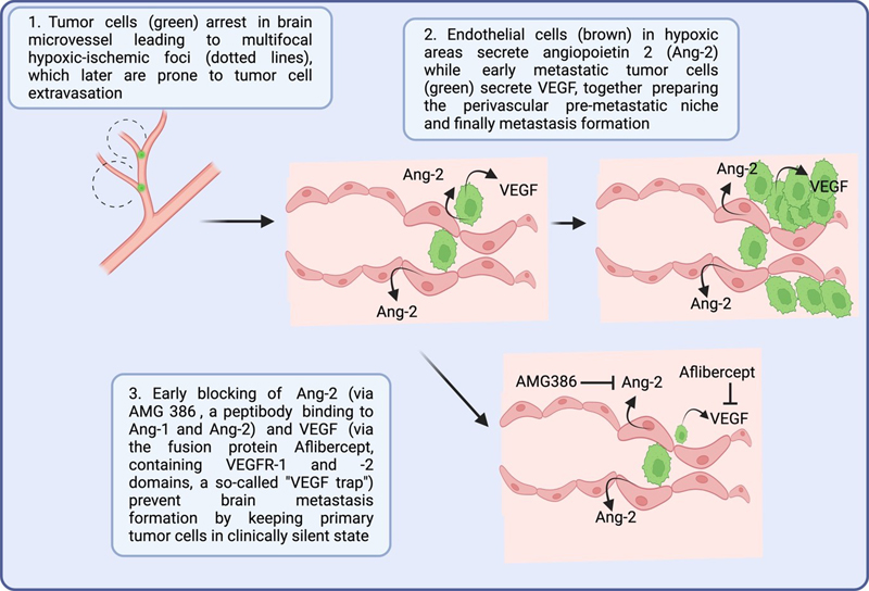 1. Impact of disturbed cerebral microcirculation and hypoxic-ischemic microenvironment on brain metastasis development [Roesler et al., 2024] Although the basic steps of brain metastasis formation, including – amongst others – detachment of cancer cells from the primary tumor and intravasation into the blood stream, followed by adhesion to brain endothelial cells and finally extravasation into as well as colonization of the brain is reiterated, the exact mechanisms and time-dependent sequences are not fully understood. In a previous groundbreaking work of Kienast et al., the metastatic ways of individual cancer cells could be traced over several months in a murine model with real-time multiphoton laser scanning microscopy [Kienast et al., 2010]. With this, the authors could identify the initial arrest of cancer cells at cerebral blood vessel branches followed by angiogenic processes or vessel cooption after early extravasation. Using a similar methodological approach, Roesler et al. were now able to show a similar intravascular tumor cell arrest in brain microvessels before extravasation and formation of micrometastases [Roesler et al., 2024]. Of note, as a most novel finding, already 24h after intracardiac injection of tumor cells, prominent hypoxic-ischemic tissue alterations were observed in the brain that were partly well corresponding with areas, in which metastasis formation was detected at a later timepoint. In the hypoxic-ischemic areas, an upregulation of Ang-2, MMP9 and VEGF was observed in brain endothelial cells leading to the hypothesis that those hypoxia-associated molecules might be at least partly responsible for the seeding of metastatic cells in the brain. To corroborate this hypothesis, the authors also used a transgenic, endothelial-specific Ang-2 gain-of-function approach that revealed an increase of numbers and volumes of brain metastases compared to wild-type animals thereby indicating that extravasation of cancer cells into the brain parenchyma is Ang-2 dependent. The findings of the study were in line with previous findings showing that Ang-2 expression correlated with BBB disruption, impaired tight junctions and increased blood vessel permeability in a murine triple-negative breast cancer model [Avraham et al., 2014]. The findings of Roesler et al. indicate that Ang-2 and VEGF are crucial for the formation of brain metastases via shaping a tumor-supporting pre-metastatic niche, therefore being potential treatment targets, especially in an early phase. With a novel, early pre-metastatic inhibition of Ang-2 (via the AMG 386 peptibody) and/or VEGF (via aflibercept, a fusion protein with VEGFR1 and VEGFR2 domains serving as a so-called “VEGF trap”), the metastatic cerebral tumor cell load could be considerably reduced (see Figure 1). Similar findings were obtained in other previous murine brain metastasis models in which a combined inhibition of Ang-2 and VEGF reduced the number and volume of brain metastases while extracranial metastases did not show a positive treatment response [Bohn et al., 2017; Kovalchuk et al., 2020]. In summary, Roesler et al. present a novel mechanism for brain metastatic processes linked to an increase of Ang-2 and VEGF in the cerebral pre-metastatic niche which are induced by focal hypoxic-ischemic events most probably caused by occlusion of brain capillaries by tumor cells. Showing a significantly reduced cerebral tumor cell load by early dual inhibition of Ang-2 and VEGF, this treatment approach could be highly promising as a prevention strategy in patients suffering from highly malignant tumors with a high risk to develop cerebral metastases. Figure 1: Concept of brain metastasis formation and therapeutic prevention