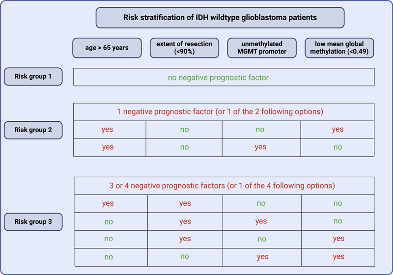 2. Global DNA methylation as independent diagnostic marker in IDH-wildtype glioblastoma [Eckhardt et al., 2024] Large population-based studies still report median survival times of slightly more than 6 months for glioblastoma patients that could be considerably increased to a median of 14.8 months in cases with maximum treatment including neurosurgical resection followed by radiochemotherapy [Brodbelt et al., 2015]. Of note, approximately 30 % of all glioblastoma patients survive 2 years or longer after initial diagnosis. Apart from age, MGMT promoter methylation, extent of resection and follow-up treatment, there is not much known about glioblastoma-intrinsic tumor biological factors that might well predict patient prognosis. Nowadays, neuropathological diagnostics in the field of neurooncology is most precisely performed by DNA methylation profiling [Capper et al., 2018]. Within the class of IDH wildtype glioblastoma, mainly 3 subclasses could be defined: receptor tyrosine kinase I (RTK I), RTK II and mesenchymal subclass, however without showing any relevant survival differences [Drexler et al., 2023b]. In general, only poor data is available about the potential prognostic impact of methylation differences within distinct tumor entities. To address this question, Eckhardt et al. assessed 492 primary and 31 relapse IDH wildtype glioblastomas that all received similar standard treatment regimen. Although no unequivocally clear methylation signature associated with patient survival could be detected, the median methylation rate of 0.49 significantly split the cohort in long (median methylation above 0.49; median overall survival of 18 months) and short (median methylation level equal or below 0.49; median survival of 13 months) time survivors. The optimal cut-off level was determined as a beta value of 0.458 that allowed for identifying a smaller subgroup of 73 patients with a median overall survival of only 9.2 months. Of note, the mean methylation level was an independent prognostic marker in a multivariate analysis together patient age, MGMT promoter methylation status and extent of resection, all factors that are known as prognosticators for a long time. The authors further showed that RTK I subclass glioblastoma had the worst median survival reaching 14.2 months while displaying significantly lower mean methylation levels compared to its counterparts that reached 15 months (RTK II) and 18.8 months (mesenchymal). However, the mean methylation levels were still significantly associated in RTK I and II subclasses. Combined risk classes including mean methylation level, age, extent of resection and MGMT promoter methylation could further increase the prognostic prediction by splitting the cohort into a risk factor-free subgroup reaching 39 months of median survival while the worst subgroup only reached 8.3 months (Figure 2). While immune cell infiltration could be bioinformatically ruled out as underlying explanatory factor, higher mean methylation levels were associated with better radiosensitivity, therefore at least providing a hypothesis why the patient subgroup with high beta values survived longer. These findings were also corroborated in a glioma cell line panel exhibiting better radiosensitivity in cells with a higher beta value. In summary, the authors provide a novel, highly important risk stratification for IDH wildtype glioblastoma patients that might also pave the way for new treatment stratifications in the future. However, a comparison with other tumor entities could not confirm high methylation levels as being associated with tumor aggressiveness in general. Figure 2: Risk stratification for IDH wildtype glioblastoma patients.