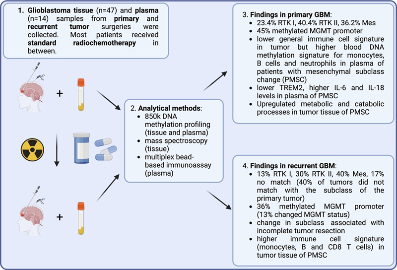Patient age over 65 years, extent of less than 90 % of the contrast-enhancing tumor area, an unmethylated MGMT promoter and a low mean global methylation beta value of less than 0.49 are considered as negative prognostic factors. Median overall survival times are as follows: risk group 1: 39 months; risk group 2: 19 months; risk group 3: 8.3 months. 3. Change in DNA methylation profile in recurrent glioblastoma [Drexler et al., 2024] DNA methylation profiling has become a highly reliable and unbiased reproducible diagnostic tool in neuropathological routine diagnostics [Capper et al., 2018]. However, only poor data exist about a temporal change of DNA methylation upon treatment in malignant brain tumors that might have an impact on treatment resistance. To address this question, Drexler et al. assessed paired primary and recurrent glioblastomas of 47 patients by DNA methylation from tumor bulk and plasma, mass spectrometry and multiplex bead-based immunoassay [Drexler et al., 2024]. A potential change even in glioblastoma subclasses might be of importance as previous analyses revealed that mesenchymal, RTK I and RTK II subclasses differed in patient survival with 15.5 months, 16 months and 27 months, respectively [Dejaegher et al., 2021]. In the primary glioblastoma cohort of Drexler et al., DNA methylation profiling revealed the following subclass distribution: 23.4 % RTK I, 40.4 % RTK II and 36.2 % mesenchymal while this composition changed to 12.8 % RTK I, 29.8 % RTK II, 40.4 % mesenchymal and 17 % with no match with a known class (Figure 3). In total, 40 % of all recurrent GBM did not match with the subclass obtained in the primary tumors (including 17 % of cases with no match). The highest percentage of transitions was towards the mesenchymal subclass (72.7 %). Thirteen percent of all patients showed a switch of the MGMT promoter methylation status, mostly from a methylated to a non-methylated status, a finding that is in line with previous analyses performed in primary and recurrent glioblastoma [Choi et al., 2021]. The authors also analyzed multiple clinical-pathological parameters but mostly found incomplete resection of contrast-enhancing tumor parts as a significant factor for subclass transition in the recurrent situation. While the cellular composition did not considerably vary between the groups with and without subclass change in general, the cohort undergoing a switch towards a mesenchymal phenotype showed for example a decreased number of immune cells in the primary tumor tissue, however did not reach the level of significance when the analyses were repeated for immune cell subtypes. In contrast, higher methylation signatures were observed for monocytes, B cells and neutrophils in blood of patients in the primary situation later showing a subclass switch towards a mesenchymal phenotype compared to the cohort with stable glioblastoma subclass in the recurrent situation. Proteomic analysis revealed a stronger metabolic and catabolic processes in the primary tumor tissue of patients later undergoing a switch to mesenchymal subclass. Of note, no association of subclass changes with patient survival was observed. This study is of high importance for the understanding of temporal molecular changes in glioblastoma and underscores the necessity to re-perform full molecular assessment in the recurrent situation, especially as also broadly accepted molecular biomarkers such as MGMT promoter methylation status may change over time. To which degree radiochemotherapy induces the temporal switch towards a mesenchymal subclass phenotype has to be further elucidated. Figure 3: Temporal molecular change between primary and recurrent glioblastoma