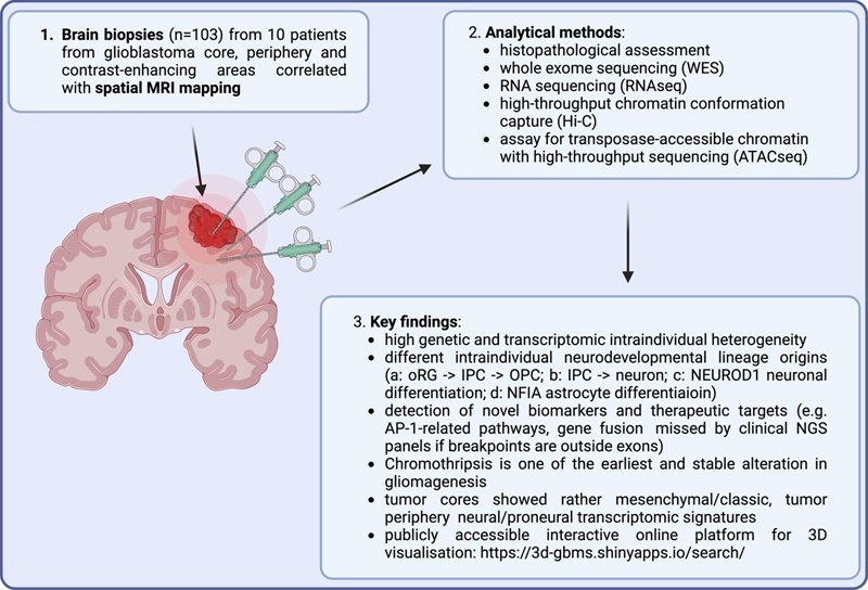 4. Glioblastoma evolution and heterogeneity from a whole tumor perspective [Mathur et al., 2024] Glioblastoma is a highly heterogenous neoplasm composed of both tumor and non-neoplastic cells of the microenvironment. In addition, little is known about the overall molecular heterogeneity including genetic, epigenetic and/or metabolic features as diagnostics is mostly performed on smaller bulk tissue parts. In a previous large-scale approach, a glioblastoma atlas linking classical histomorphological features with transcriptional profiles, the latter assessed by in-situ hybridization, revealed a strong regional molecular heterogeneity partly related to microscopic characteristics [Puchalski et al., 2018]. However, as these previous findings were also derived from preselected tissue blocks not representing the entire regional spectrum of glioblastoma, Mathur et al. sampled multiple tissues (n = 103) from the 10 patients using 3D surgical neuronavigation to obtain representative areas of the tumor core, periphery and contrast-enhancing regions [Mathur et al., 2024]. Furthermore, the biopsy positions were correlated with preoperative MRI scans to generate a representative 3D model of the entire glioblastoma. The small biopsy samples were assessed by histopathological analyses, high-throughput chromosome conformation capture (Hi-C), whole exome sequencing (WES), RNA sequencing (RNA-seq) as well as assay for transposase-accessible chromatin with high-throughput sequencing (ATAC-seq, for tissue and single nucleus) (for summary, see Figure 4). The authors detected a vast genetic and transcriptional heterogeneity within the patients. Only one out of the ten patients showed a consistent signature in all biopsies regarding the previously published, gene expression-based molecular classification into proneural, neural, classic or mesenchymal subtypes while all other patients displayed mixed intraindividual signatures [Verhaak et al., 2010]. Of note, tumor biopsies from the tumor cores more frequently showed a mesenchymal or classic signature while more peripheral biopsies revealed rather neural or proneural signatures. The authors also discovered distinct neurodevelopmental transcriptomic signatures such as for example glioblastoma with a gain of chromosome 7 (with the EGFR, PTPRZ1 and PTN genes) being associated with glioblastoma cells in an intermediate progenitor cell (IPC) transit-amplifying state or – in contrast - glioblastoma with a primitive neuronal component, however without a gain of chromosome 7, showing transcriptional signatures typically observed in cells differentiating from IPCs to neurons. Additional signatures in the tumor center comprised an immune-hot microenvironment with interferon signaling and T cell infiltration versus immune-cold areas with a mesenchymal transcriptomic signature. While most mutations were highly heterogenous, chromothripsis seems to be a very early event in gliomagenesis with virtually no intraindividual heterogeneity. Most importantly, the authors presented several novel potential diagnostic biomarkers and treatment targets, such as the activator protein 1 (AP-1) pathway or several gene fusions that were missed by clinical NGS analyses as breakpoints were outside exons. With this work, Mathur et al. considerably contributed to the understanding of glioblastoma evolution and heterogeneity and provide promising therapeutic targets for further assessment. For more in-depth exploration of the findings, a publicly accessible interactive online platform is available: https://3d-gbms.shinyapps.io/search/. Figure 4: 3D glioblastoma evolution and heterogeneity: methodological approach and key findings.