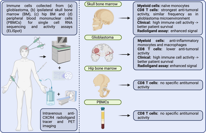 Abbreviations: oRG: outer radial glia; IPC: intermediate progenitor cell; OPC: oligodendrocyte precursor cell; NEUROD1: neuronal differentiation 1 (transcription factor); AP-1: activator protein 1 (transcription factor). 5. Cranioencephalic functional lymphoid units in glioblastoma [Dobersalske et al., 2024] Bridging veins allow for an immunological communication between CNS and skull bone marrow crossing the arachnoid barrier by connecting CNS blood vessels with the meningeal blood circulation and finally the sinusoidal vasculature of the bone marrow [Smyth et al., 2024]. As hematopoietic stem and progenitor cells are located in the skull bone marrow, however not well studied in the context of human diseases, Dobersalske et al. intended to assess the immune cell properties in those areas in regional proximity to human glioblastoma, a condition known for its highly immunosuppressive nature [Dobersalske et al., 2024]. Using a CXCL12 analog radioligand tracer for CXCR4, a marker for hematopoietic and immune cells, the authors found surprisingly high activity in the ipsilateral skull bone marrow and meninges related to the glioblastoma localization in usually older glioblastoma patients. In a single-cell RNA sequencing approach from corresponding (a) glioblastoma samples, (b) ipsilateral bone marrow of the skull, (c) peripheral blood mononuclear cells (PBMCs) and (d) distal hip bone marrow, considerable differences in immune cell compositions were found. Regarding the myeloid cell compartment, mostly naïve monocytes were found the ipsilateral skull bone marrow contrasting anti-inflammatory monocytes and macrophages, predominantly found within glioblastoma. Of note, a strong accumulation of effector-type, glioma-reactive CD8+ T cell activity was detected in the skull of ipsilateral bone marrow whereas a lower activity was found in intratumor CD8+ T cells. Both CD8+ T cells from PBMCs and ipsilateral bone marrow were able to experimentally reproduce memory and effector T cells, while intratumor T cells failed. Of note, the antitumoral activity of skull bone marrow derived CD8+ T cells was higher compared to counterparts derived from PBMCs, distal hip bone marrow or the glioblastoma microenvironment. Similarly high frequencies of tumor-reactive T cells were found in skull bone marrow compared to the intratumor microenvironment, indicating an immune cell trafficking between both compartments. Using the aforementioned radioligand tracer, a significantly longer survival benefit for glioblastoma patients with stronger intratumor and skull bone marrow immune cell activity was observed already in a relatively small patient cohort (n = 52). Taking the clinical impact into account, these findings imply that the skull bone marrow immune cell niches should be absolutely protected during neurosurgical and subsequent radiotherapeutic intervention. In summary, Dobersalske et al. shed a new light of the local antitumoral immune cell activities in glioblastoma patients that needs to be considered for future immunotherapies (for summary, see Figure 5). Figure 5: Cranioencephalic functional lymphoid units in glioblastoma.