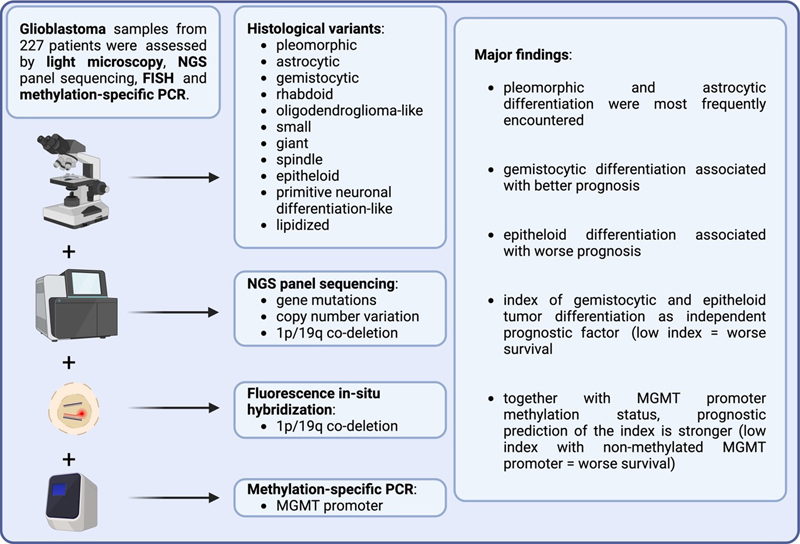 Left side: methodological set-up. Right side: major findings according to compartment. 6. Prognosis prediction via histomorphological features in glioblastoma [Kirishima et al., 2024] Neuropathological tumor diagnostics is more and more shifting away from the previous gold standard of microscopic analysis to more unbiased molecular methods mostly including genetic and epigenetic assessment for both diagnostic precision as well as prediction for treatment response and patient survival. As molecular, especially epigenetic features seem to be more stable than the highly variable morphological features in glioblastoma, it is extremely important to always sample enough tissue from all different tumor areas (e.g. core, periphery, contrast-enhancing areas, necroses etc.) [Mikkelsen et al., 2021]. It is very interesting for neuropathologists if complex histomorphological assessments can still compete with modern molecular diagnostics. Kirishima et al. undertake the endeavor to explore if distinct morphological features may still be of prognostic value in glioblastoma. As for today, a few studies showed worst survival for some glioblastoma subtypes such as epithelioid or rhabdoid variants, no unequivocally clear association of any specific morphological phenotype with clinical prognosis could be detected [Mallick et al., 2022]. Furthermore, most classical microscopic characteristics necessary for the diagnosis of glioblastoma, such as pseudopalisading necrosis or microvascular proliferations, are no longer sufficient for this diagnosis as they might also be found in IDH-mutant astrocytoma [WHO classification of brain tumors, 2021]. Therefore, the authors of the present study analyze 227 primary glioblastoma according to the WHO criteria for the classification of tumours of the central nervous system from 2021 and additionally assessed the following microscopic features in 10 % increments: pleomorphic, astrocytic, gemistocytic, rhabdoid, oligodendroglioma(ODG)-like, small, giant, spindle, epithelioid, primitive neuronal differentiation(PND)-like and lipidized [Kirishima et al., 2024; WHO classification of brain tumors, 2021]. For histomorphological assessment to construct a survival prediction model, the largest, most representative areas were analyzed by two board-certified pathologists. Of note, also NGS panel analysis for genomic profiling, including assessment of gene mutations, copy number variation and 1p/19q co-deletion as well as methylation-specific PCR to determine MGMT promoter methylation status were performed leading to an integrated final diagnosis together with histological and immunohistochemical (e.g. for IDH1-R132H) features. As major morphological variants, pleomorphic (33 % of total tumor area) and astrocytic (29.1 %) differentiation were reported. Most interestingly, if glioblastoma showed epithelioid tumor cells in more than 30 % of total tumor cells, patients displayed an unfavorable prognosis independent of clinical parameters, treatment or molecular alterations. The most favorable prognostic values for glioblastoma patients could be achieved by calculating a combined score taking into account both gemistocytic and epithelioid areas as follows: % area of gemistocytic cells minus 4 x % area of epithelioid cells. A value of less than 20 % of this index was an independent significant factor for worse survival in a multivariate analyses together with age, medullary dissemination, chemotherapy and MGMT promoter methylation status (for summary see Figure 6). The prediction for patient survival could be further increased by combining this index with the MGMT promoter methylation status, showing worst patient survival for the combination of a low index together with an unmethylated MGMT promoter. As only 6 out of 227 displayed an epithelioid phenotype, the results certainly have to be considered with caution, nevertheless, the prognostic impact of such a differentiation seemed to be strongly associated with negative patient survival even in a multivariate analysis. Although a detailed definition of cell morphology is provided by the authors, the reproducibility of such an analysis with still suffer from the subjective interpretation of individual neuropathologist. If this approach should enter the diagnostic routine, future automated digital image analysis would be preferable to undoubtfully recognize and grade the morphological parameters. Figure 6: Prognostic prediction of histological features in glioblastoma