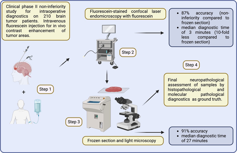 7. Confocal laser microscopy for intraoperative histopathological diagnostics of intracranial tumors [Wagner et al., 2024] Intraoperative diagnostics performed on frozen sections is time-consuming, often lasting around 20 minutes from tissue sampling out of the surgical cavity to the final transmission of the diagnosis [Novis and Zarbo, 1997]. In addition, only single, mostly very small tissue fragments can be assessed at a time. Even in highly specialized tertiary medical centers, a diagnostic shift of 18 % between intraoperative and post-operative diagnoses was reported, actually leading to a second subsequent neurosurgical intervention in 3 % of all brain tumor patients [Harms et al., 2023]. Therefore, there is an urgent need for faster methods that can also repeatedly analyze larger tissue areas, ideally in real-time and/or directly in situ. To address this issue, Wagner et al. conducted a phase II clinical study to test the noninferiority of fluorescein-stained intraoperative confocal laser endomicroscopy (CLE) compared to the classic assessment of frozen sections by neuropathologists in 210 adult brain tumor patients. CLE (using the ZEISS CONVIVO system) is a non-invasive/non-traumatic technique that enables histopathological assessment in vivo almost in real time. In addition, fluorescein sodium acts as a contrast-enhancing intraoperative dye for an easier identification of the tumor-suspicious areas. Of note, no serious adverse events were reported, neither in relation to CLE nor to fluorescein. Compared to the final neuropathological diagnoses, a correct result was obtained in 87 % of CLE-assessed samples, while classic frozen sections achieved 91 %, demonstrating the noninferiority of the CLE method (Figure 7). The concordance rate between CLE and classic frozen sections was 76 %. Most importantly, the median time until CLE diagnosis was communicated was 3 min compared to 27 min in classic frozen sections, resulting in a nearly 10-fold reduction of time required for intraoperative neuropathological assessment. In summary, in vivo CLE assessment for intraoperative neuropathological diagnostics is a highly reliable and significantly faster approach that could at least partially replace frozen section diagnostics in the future. In addition, a considerably higher amount of tissue images could be processed thereby further increasing its diagnostic validity. Figure 7