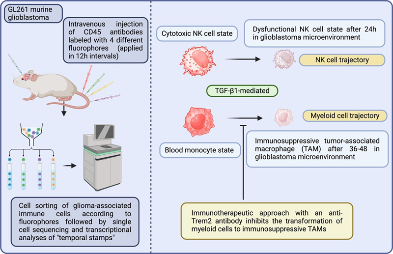 Diagnostic set-up and major results for clinical phase II non-inferiority study for intraoperative neuropathological assessment using fluorescein-stained confocal laser endomicroscopy. 8. Brain tumor diagnostics from cell-free DNA from cerebrospinal fluid [Afflerbach et al., 2024 and Hickman et al., 2024] Precise brain tumor diagnostics still relies on highly invasive procedures to obtain tissue samples for microscopic or molecular diagnostics. As high rates of intraoperative adverse events have been reported for neurosurgical interventions reaching up to 40 %, there is a strong need for non- or less invasive diagnostic procedures in neurooncology [Drexler et al., 2023a]. Ideally, a non-operative tumor classification could even prevent patients from invasive follow-up procedures as in the case of CNS lymphoma. A second important reason for why non-invasive diagnostics would considerably improve patient care would be related to the detection of early recurrences or minimal residual tumor load. Some studies have shown the suitability of sequencing techniques to detect tumor-specific mutations from cell-free DNA of the CSF in some tumor entities such as gliomas [Miller et al., 2019]. For other brain tumor entities, such as medulloblastoma, non-invasive molecular diagnostics from cell-free DNA from cerebrospinal fluid (CSF) has already been proven to be superior to cytological diagnostics with regard to both the detection of residual tumor and the prediction of patient prognosis [Liu et al., 2021]. To evaluate the suitability of molecular diagnostics on CSF-derived cell-free DNA across broader brain tumor cohorts, different research teams employed various approaches. Consequently, two exceptional papers were selected under a single topic. Afflerbach et al. analyzed a larger cohort of 110 samples from 99 patients with suspicion of primary brain tumor using Nanopore sequencing (at least 5ng DNA per sample was needed), a technique which, in addition, also considerably reduces the time needed for sample preparation and sequencing [Afflerbach et al., 2024]. In 45 % of the samples, circulating tumor DNA (ctDNA) could be detected in the CSF. Among the samples in which ctDNA was successfully detected, only the copy number variation (CNV) profile could be defined in 56 % (n = 28), only DNA methylation profiling in 12 % (n = 6), and both types of information in 32 % (n = 16). The CNV profile revealed several diagnostically relevant amplifications as well as larger chromosomal gains and losses. Of note, corresponding cytological analyses detected tumor cells in only 9 cases. With their groundbreaking study, Afflerbach et al. provided evidence that Nanopore sequencing is a fast and reliable diagnostic technique allowing for determining both CNV and DNA methylation profiles from ctDNA from CSF in brain tumor patients. In another approach, Hickman et al. performed mutational analyses of CSF circulating ctDNA from 711 brain tumor patients using an FDA-authorized targeting next-generation sequencing platform [Hickman et al., 2024]. Similarly to the findings of Afflerbach et al., also Hickman and colleagues detected tumor-specific mutations in 53 % of all patient samples with clinically documented CNS tumors, whereas none of the control samples showed a false positive result, therefore constituting a highly specific diagnostic approach. Considering the technical limitations of various approaches, nanopore-based sequencing is particularly constrained by low genomic coverage, making it unsuitable for the reliable detection of point mutations [Emiliani et al., 2025]. Moreover, since short-read next-generation sequencing techniques have successfully identified tumor-specific mutations with as little as 0.1 ng of cell-free DNA from CSF, a methodological comparison of different sequencing techniques is essential to determine the most suitable approach [Miller et al., 2022]. These approaches will considerably change our initial diagnostic approach and treatment survey in neurooncology in the future. 9. Time-dependent single-cell phenotyping of immune cells in glioblastoma [Kirschenbaum et al., 2024] Single cell RNA sequencing techniques revolutionized the understanding of individual cell states about which one could only speculate from data derived from bulk sequencing [Ramsköld et al., 2012; Tang et al., 2009]. However, it is still challenging to decipher how cell states change over time under distinct conditions, such as for example the effect of the tumor microenvironment on infiltrating immune cells. To address this question, Kirschenbaum et al. developed a new method called Zman sequencing (“Zman” is the phonetic spelling of the Hebrew word for “time”) which combines the use of fluorophore pulse labels in the blood as temporal stamps with single cell RNA sequencing [Kirschenbaum et al., 2024]. The authors intravenously applied four times an identical antibody directed against CD45 that, however, was labeled each time with a different fluorophore (n = 4 in total) in 12h intervals (between 24–60h or 12–48h before mice were sacrificed). After having confirmed that the fluorophore-coupled antibodies (a) almost exclusively stain immune cells in the blood stream, (b) can be reliably detected on immune cells over 96h, (c) do not penetrate the brain and (d) are virtually completely degraded in the blood within 60–90 min, transcriptional molecular trajectories of natural killer (NK) and myeloid cells in the syngeneic GL261 murine glioblastoma model were assessed. One can assume that CD45-positive immune cells labeled with one of the four distinct fluorophores encountering in the glioma tumor microenvironment mostly infiltrated the brain via the blood stream within a time frame of +/- 12h before the application of the next, subsequent fluorophore-labeled antibody. With this approach, a temporal transcriptional kinetic profile can be calculated for each immune cell type within the glioma microenvironment. 