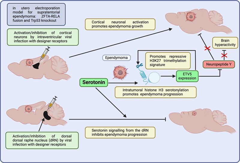 Left side: methodological set-up. Right side: major findings of NK and myeloid cell/TAM transcriptional trajectories. 10. Histone serotonylation regulates ependymoma tumorigenesis [Chen et al., 2024] Ependymomas constitute a heterogeneous group of CNS tumors that are currently classified into at least nine distinct molecular subtypes and are partly considered an epigenetic disorder [Stuckert et al., 2020]. As recent studies have revealed a direct epigenetic modification of histone H3 by serotonin, a process termed 'serotonylation,' a potential link between serotonin-induced histone alterations and the development and progression of ependymoma has been hypothesized [Farrelly et al., 2019]. To address this hypothesis, Chen et al. generated ependymomas by performing in utero electroporation to insert the ZFTA-RELA fusion gene and knock out Trp53, a tumor suppressor gene. Additionally, a designer receptor exclusively activated by designer drugs (DREADD) approach was employed to modulate neuronal activity in cortical neurons and dorsal raphe nucleus neurons. This was achieved by injecting non-naturally occurring receptors into distinct brain areas via viral vectors, which were subsequently activated by a synthetic ligand. The authors showed that the activation of excitatory cortical neurons promoted the development of ZFTA-RELA fusion-driven ependymomas and identified serotonergic activity in the dorsal raphe nucleus – an area remote from the ependymoma – as a suppressive factor for ependymoma progression. However, established, both murine and human ependymoma cells also displayed a considerable higher amount of serotonylated H3 compared to normal CNS tissue and histone serotonylation was associated with tumor progression, providing evidence that serotonin signaling may have a rather disparate role in ependymoma tumor biology. In the experimental setting, ETS transcription variant factor 5 (ETV5), a transcription factor with binding sites for both serotonylated H3 and the ZFTA-RELA fusion, was identified as a tumor-promoting factor. The authors further demonstrated that ETV5 was associated with a repressive H3K27 trimethylation signature and decreased neuropeptide Y (NPY) expression in ependymoma. Moreover, ETV5 overexpression abrogated NPY-mediated synaptic inhibition in the tumor microenvironment, which was linked to reduced tumor growth (Figure 9). Figure 9: Disparate effects of serotonin in ependymoma tumorigenesis.
