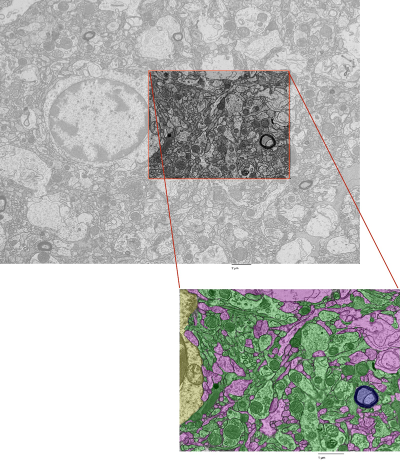 Fine-scale annotation of ultrastructural components in one representative EM image from the cortex of donor #7. Color coding identifies distinct cellular structures: Green: membrane-bound structures with electron-dense interior (e.g., organelle-rich neurites); Purple: membrane-bound structures with electron-lucent interior (e.g., swollen astrocytic processes); Blue: myelinated axons; Yellow: cell bodies. Non-colored regions represent ambiguous interstitial zones (AIZs) that lack clearly defined membrane boundaries. Upper scale bar: 2 μm. Lower scale bar: 1 μm. Figure 2