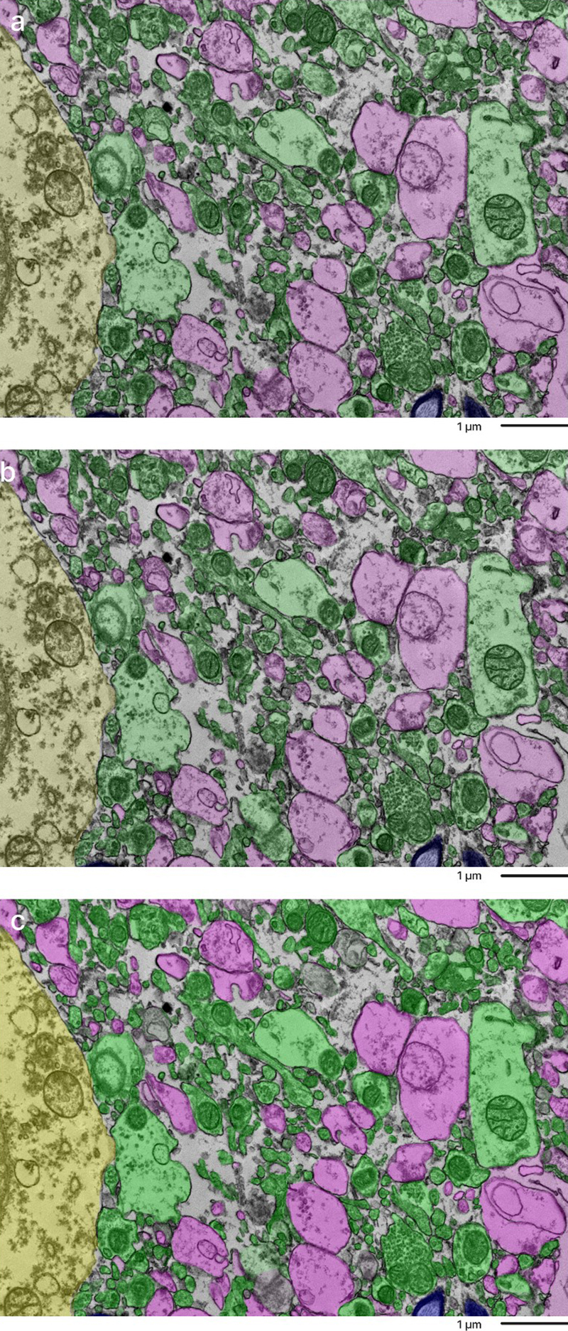 Overlap of annotations of a sample from the cortex of donor #66 by independent annotators. The top and middle image were done by two independent annotators. The bottom image is a combination of the overlays to compare how alike the two annotations are. Color coding identifies distinct cellular structures: Green: membrane-bound structures with electron-dense interior (e.g., organelle-rich neurites); Purple: membrane-bound structures with electron-lucent interior (e.g., swollen astrocytic processes); Blue: myelinated axons; Yellow: cell bodies. Non-colored regions represent ambiguous interstitial zones (AIZs) that lack clearly defined membrane boundaries. Scale bars: 1 μm. Figure 3