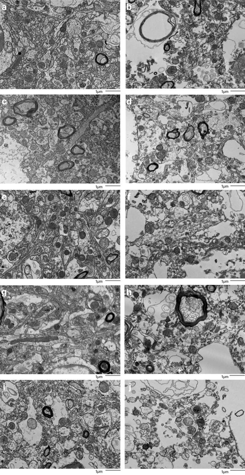 Representative EM images graded as having or not having ambiguous interstitial zone (AIZ) artifacts. Five examples images are shown that were graded as having AIZ artifacts: 30-T (b), 39-C (d), 59-C (f), 59-T (h), 66-T (j), as well as five examples that were not: 7-C (a), 57-C (c), 65-C (e), 65-T (g), 66-C (i), where the number is the donor ID number, and then “-T” indicates that it is from the thalamus and “-C” from the cortex. Scale bars: 1 μm.