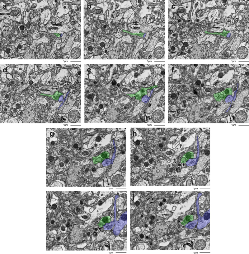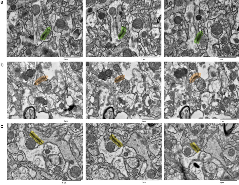 Representative images in the serial section TEM data sets showing that synapses can be traced. Samples from the cortex of donor IDs #7 (a), #35 (b), #65 (c). Synapses are highlighted in color. Scale bars: 1 μm. Figure 6
