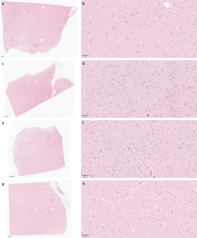Representative serial section image stack with annotations for afferent neurites from one synapse. All images are from a serial section from the cortex sample of donor #65. Scale bars: 1 μm. Preservation quality in light microscopy images We next set out to compare preservation quality between modalities. We started by performing an analysis of H&E-stained light microscopy sections. These samples were obtained from the contralateral hemisphere of the same brain regions that were examined by electron microscopy. We detected expected postmortem changes in all images, including pericellular rarefactions, perivascular rarefactions, and neuropil vacuolization (Krassner et al., 2023). Qualitatively, the extent of pericellular rarefaction and neuropil vacuolization appeared to potentially be more pronounced in some cases with longer PMIs. However, no obvious differences in the preservation quality of cell membrane morphology were observed that corresponded with the PMI on these H&E-stained images (Figure 7). Additionally, the postmortem artifacts visualized did not have obvious qualitative differences based on the fixation time. Taken together, these findings suggest that basic cellular morphology remains largely intact at the light microscopy level in the samples from these brains, despite the range of PMIs. Figure 7