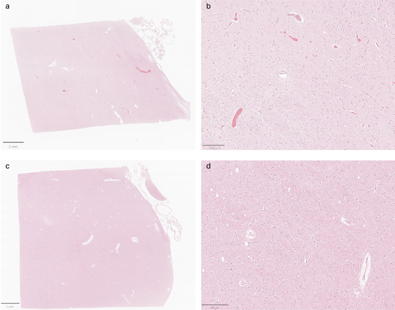 Representative H&E-stained images from the thalamus showing variable vascular clearance. a, b: Images from donor #30 show extensive intravascular material. c, d: Images from donor #59 show minimal intravascular material. Scale bars: (a, c) 2 mm; (b, d) 200 μm.