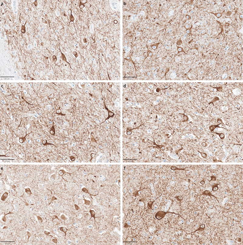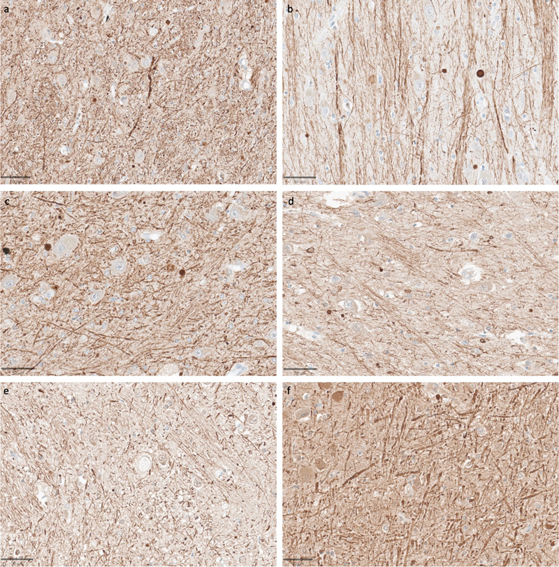 Representative SMI-312-stained images demonstrate that axonal morphology is generally intact across a wide range of PMIs. Samples from the thalamus of donor IDs #65 (a), #78 (b), #7 (c), #37 (d), #59 (e), and #57 (f) with PMIs of 1.5 h, 2.5 h, 4.25 h, 72 h, 91 h, and 96 h, respectively. Scale bars: 50 μm. Staining for SMI-311, an antibody targeting non-phosphorylated neurofilaments that are primarily located in the dendrites and perikarya, also revealed consistent staining quality across samples with varying PMIs (Figure 10) (Ulfig et al., 1998). Dendritic morphology appeared to be largely intact, without the diffuse staining that would be expected with widespread breakdown of the dendritic cytoskeleton. A key exception was the canine brain, which did not stain adequately for this antibody in either brain region, possibly reflecting molecular differences in neurofilaments between human and canine brains (Dimakopoulos and Mayer, 2002). Figure 10
