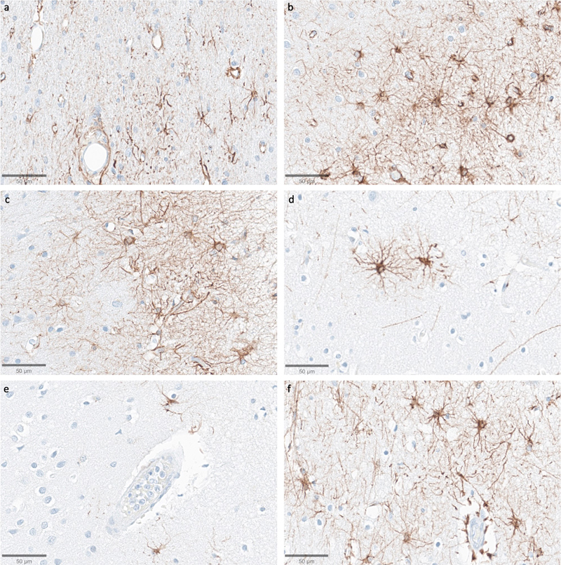 Representative SMI-311-stained images demonstrate that dendritosomatic morphology on light microscopy is generally intact across a wide range of PMIs in human brains. Samples from the thalamus of donor IDs #78 (a), #7 (b), #30 (c), #37 (d), #59 (e), and #57 (f) with PMIs of 2.5 h, 4.25 h, 17 h, 72 h, 91 h, and 96 h, respectively. Scale bars: 50 μm. We next assessed immunostaining for the astrocyte marker GFAP (Figure 11). In samples from the thalamus, we observed that GFAP staining was generally lower compared to the cortical samples, with the exception of the subependymal area, which consistently showed higher immunoreactivity. In the cortical samples, the subpial area consistently had the highest density of staining, which is expected given previous findings about GFAP staining patterns (Halliday et al., 1996). The density of GFAP staining in the cortex appeared to be lower in some cases with longer PMIs, which had very few astrocytes stained by anti-GFAP (for example, see Figure 11e). However, there was no robust trend for lower GFAP staining with longer PMIs, as evidenced by strong staining in some samples that had relatively longer PMIs, such as one brain with a PMI of 96 hours (Figure 11f). Moreover, when GFAP-positive astrocytes were visible in the longer PMI cases, the individual cells that were stained appeared to still have intact morphology without obvious signs of partial decomposition, arguing against cellular decomposition playing the major role in mediating staining differences. However, given our relatively small sample size, we cannot clearly distinguish the reasons for variability in GFAP staining across samples. Figure 11