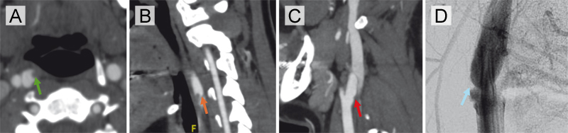 Figure 1. Imaging findings of a right carotid artery web with superimposed thrombus and interval resolution. (A) Axial CTA demonstrating a shelf-like projection along the posterior wall of the right internal carotid artery (ICA) with superimposed thrombus (green arrow). (B) Corresponding sagittal CTA confirming the presence of thrombus overlying a carotid web in the right ICA (orange arrow). (C) Follow-up sagittal CTA performed after anticoagulation shows resolution of thrombus with a small residual carotid web in the proximal right internal carotid artery (red arrow). (D) Digital subtraction angiography (DSA) confirms the presence of a subtle right carotid artery web without flow-limiting stenosis (blue arrow).