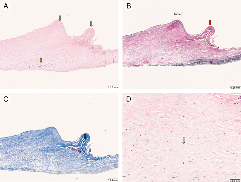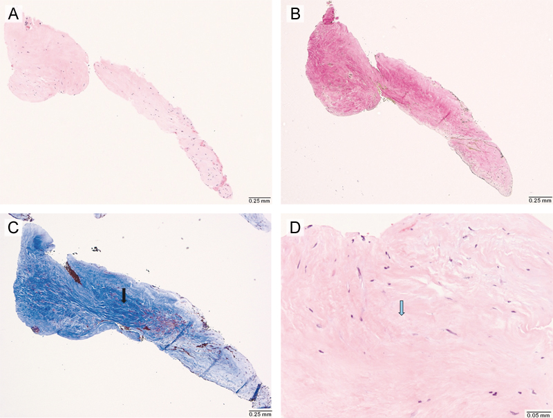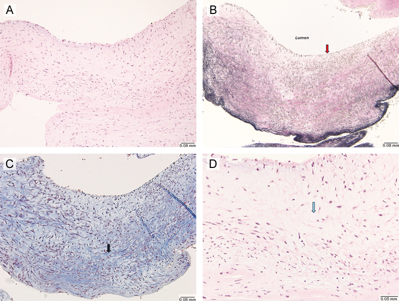 Figure 2. Histological findings of carotid artery web resected via endarterectomy (Hematoxylin and Eosin stain, Elastic stain). (A) Low-power (10×) microscopic view showing a single fragment of fibrovascular tissue, without evidence of thrombus formation, lipid deposition or inflammatory infiltrate. (B) Elastic stain (10×) demonstrating the absence of an internal elastic lamina (red arrow). (C) Trichrome stain (10×) showing increased fibrosis (black arrow). (D) High power (20×) view highlighting areas of myxoid degeneration (blue arrow). Case 2 A man in his 50s with no significant past medical history presented with signs of a right middle cerebral artery (MCA) syndrome, three weeks after a transient ischemic attack (TIA) affecting the same hemisphere. His admission NIHSS was 6. A non-contrast head CT was negative for hemorrhage, and CT angiography of the head and neck revealed an occlusion of the right M1 segment. He underwent mechanical thrombectomy with successful TICI 2c recanalization. Cardiac workup, including transthoracic echocardiography (TTE), telemetry, and hypercoagulable testing, was unremarkable. Vascular imaging revealed a small right internal carotid artery (ICA) web with superimposed thrombus (Figure 2A and B), which had not been present on prior imaging performed during his initial TIA evaluation (Figure 3C). Due to recurrent vascular events ipsilateral to CW, he underwent a right carotid endarterectomy (CEA) during the same hospitalization. Gross examination of the specimen revealed multiple fragments of tan soft tissue 1.1 x 1.1 x 0.2 cm in aggregate. Examined histologic sections demonstrated fragments of fibrovascular tissue consisting of vascular smooth muscle cells in a background of myxoid degeneration and increased fibrosis. In this case, no lipid or inflammatory component was identified either (Figure 4). At his most recent follow-up, 11 months after the initial event, he had not experienced a recurrent ischemic stroke.