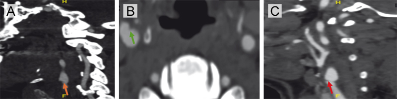 Figure 3. Interval development of thrombus over a carotid artery web in a patient with recurrent ischemic events. (A) Axial CTA at the time of large vessel occlusion demonstrates a carotid web in the right internal carotid artery with superimposed thrombus (orange arrow). (B) Corresponding sagittal view confirms the presence of thrombus overlying the web in the proximal right internal carotid artery (green arrow). (C) Imaging performed three weeks earlier during workup for TIA shows the same carotid web without thrombus (red arrow).