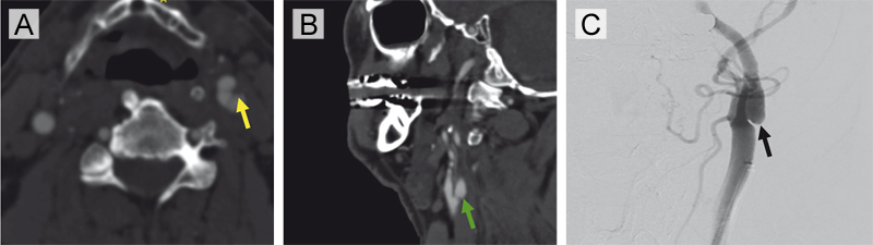 Figure 5. Radiographic imaging of a carotid artery web (CW) without evidence of superimposed thrombus in a patient with recurrent large-vessel occlusions (Case 3). (A) Axial CTA demonstrates a shelf-like projection along the posterior wall of the left internal carotid artery, consistent with a carotid web in the proximal left ICA (yellow arrow). (B) Corresponding sagittal CTA confirms the non-stenotic web morphology in the absence of atherosclerosis (green arrow). (C) Digital subtraction angiography (left common carotid contrast injection) reveals a subtle web-like filling defect in the proximal consistent with a carotid artery web (black arrow).