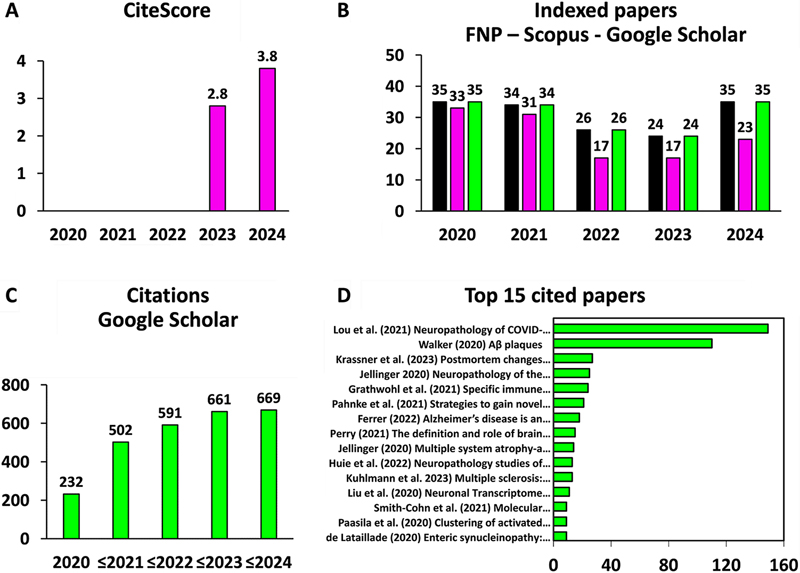 Fig. 1. Citation of FNP papers. A. CiteScore values for FNP from 2020 to 2024. The CiteScore is defined as the number of a journal’s citations during a four-year period divided by the number of citable items published during the same period. B. Number of FNP papers (in black) indexed in the Scopus database (in pink) or the Google Scholar database (in green). C. Cumulative plot showing the number of citations received by FNP papers. FNP papers published in 2020 were cited 232 times by 2024. FNP papers published in 2021 or before were cited 502 times by 2024. Taken together, published FNP papers received a total of 669 citations by 2024. D. Top 15 cited FNP papers according to Google Scholar and the number of their citations. Using Google Scholar, we determined that FNP papers received a total of 669 citations until 2024, with a progressive increase in citations over time (Fig. 1C). The hitherto most cited FNP paper with 149 citations is entitled ‘Neuropathology of COVID-19 (neuro-COVID): clinicopathological update’ by Lou et al. (2021) [9], reflecting the high impact of the COVID-19 pandemic on the field of neuropathology (Fig. 1D). The other most cited FNP papers concern neurodegenerative diseases with an emphasis on Alzheimer disease, brain tumors, and neuroinflammatory diseases including multiple sclerosis (Fig. 1D). Taken together, the 15 top cited FNP papers received 466 citations, meaning that about 10 % of the published FNP papers account for 70 % of the journal’s citations. This is comparable to the journal Nature, where the 25 % most cited papers contributed 89 % citations to its impact factor of 32.1 in 2005 [10, 11]. Electronic access of FNP papers In addition to the citation analysis, we evaluated the extent to which FNP papers were electronically accessed. We defined access to an FNP paper as any electronic consultation of its HTML full text or download of its PDF. This operational definition does not discriminate between partial and complete reads or between single and multiple accesses by the same user (i.e., IP address), which should however not significantly change the outcome of the analysis. We analyzed access to all 154 FNP papers published from 1st January 2020 to 31st December 2024 through either the FNP website or the PubMed/PMC website. We found that FNP papers were accessed 407 000 times in total, reflecting a mean number of 2 647 accesses to each individual paper. Among the 15 most accessed papers (Fig. 2A), there was one entitled "Aβ plaques" by Walker (2020) [12] with 23 573 accesses and another one entitled "Multiple Sclerosis: 2023 Update" by Kuhlmann et al. (2023) [13] with 12 250 accesses. We wondered whether these papers were primarily accessed through the journal's website or through PubMed/PMC which has been indexing FNP papers since May 2023. We found that the monthly number of accesses has been significantly increased by PubMed/PMC (Fig. 2B–C), rewarding the long-term efforts to get FNP papers indexed in the PMC database. However, electronic access via the FNP website remained considerable, suggesting that the FNP website will continue to be a major gateway to FNP papers in the future.