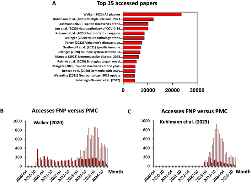 Fig. 2. Electronic consultation of FNP papers. A. The 15 most accessed FNP papers with the corresponding number of accesses. B and C. Access over time to the two most accessed FNP papers from 2020 (B) and 2023 (C) via the FNP website (in dark red) or the PMC website (in light red). Access to FNP papers was analyzed through an Excel file merging five separate datasets: (1) an FNP dataset comprising author name, title, publication date, document identifier (DOI) and PMC ID, (2) an FNP dataset comprising global bibliographic metrics for each paper, (3) an FNP dataset comprising monthly bibliographic metrics, (4) a PMC dataset comprising monthly bibliographic metrics, and (5) a Google Scholar dataset comprising bibliographic metrics. FNP research topics FNP aims to publish research papers across the entire spectrum of neuropathology. We therefore determined how different neuropathology research topics were covered by FNP through original papers or reviews (Fig. 3A–B). We found that the number of papers (not accesses) concerning neurooncology and neurodegeneration corresponded to approximately 29 % and 23 % of all papers, respectively. Fifteen percent of FNP papers focused on neuroinflammation, primarily on the neuropathology of COVID-19. Papers concerning neuromuscular, neurodevelopmental, neurovascular, or neurotrauma topics represented between 6 % and 9 % of papers, while 2 % of papers concerned epilepsy (Fig. 3A). All research topics were equally well accessed, achieving a mean of about 3 000 to 4 500 accesses per topic (Fig. 3B). Thus, FNP papers efficiently cover the entire spectrum of neuropathology.