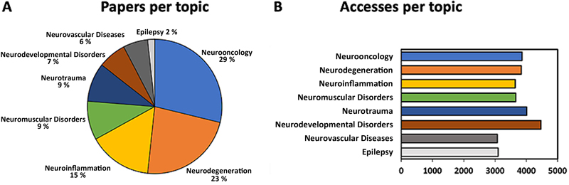 Fig. 3. FNP papers per topic. A. Percentage of FNP papers concerning different neuropathology topics. Abstracts from neuropathological societies and papers that cover personal recollections, flashbacks, or neuropathological techniques are not included. B. Mean number of accesses to FNP papers per neuropathological topic. Categories of FNP papers FNP papers fall into traditional categories (reviews, original papers, letters, and case reports), as well as less traditional categories such as opinion papers, reflection papers, flashback papers and meeting proceedings. We found that original papers were well consulted with a mean of about 2 500 accesses per paper (Fig. 4A). FNP reviews were highly accessed, with clinicopathological updates, which achieved a mean of 7 500 accesses per paper, having a particularly large impact (Fig. 4A). Remarkably, opinion, reflection, and flashback papers also received a wide attention (Fig. 4A). For instance, the opinion paper by Cevik et al. on COVID-19 neuropathology [14], the reflection paper by Budka on neuropathology through the ages [15], and the flashback paper by Kasper on Taylor's focal cortical dysplasia [16] were each accessed more than 3 500 times (not shown). Furthermore, we found that the annual meeting proceedings (abstracts) of the German, French, Canadian, Indian, and Australian/New Zealand neuropathological societies were accessed a mean of 900 times (Fig. 4A–B).