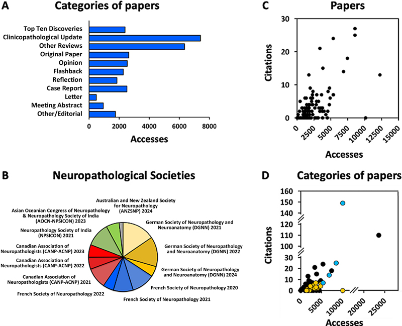 Fig. 4. Consultation of FNP papers belonging to different categories. A. Mean number of accesses to FNP papers in each publication category. B. Accesses to abstracts of the annual meetings of the German, French, Canadian, Indian/Asian and Australian/New Zealand neuropathological societies, as a fraction of the total. C. The number of accesses (x-axis) and the number of citations (y-axis) are significantly correlated (R = 0.696). Two papers with a very large number of citations (see D) are excluded from the graph for clarity. D. Number of accesses (x-axis) and citations (y-axis) for FNP papers representing clinicopathological updates (turquoise), top ten papers (orange), or other categories (black). The ratio between the number of citations and the number of accesses differs significantly among the three categories of papers (p < 0.01 by Mann-Whitney test). The analysis included only the papers published prior to 2023 to ensure at least two years of data. Finally, we analyzed the extent to which papers of the different categories were both accessed and cited. Overall, the access and citation numbers were strongly correlated (R = 0.696), (Fig. 2C). However, significant differences were observed between categories. Indeed, clinicopathological updates received a mean of 6 citations per 1 000 accesses, whereas annual research updates (Top Ten papers) received tenfold fewer citations (0.6 citations per 1 000 accesses). Papers in all other categories had a mean of 1.6 citations per 1 000 accesses (p < 0.01, Mann-Whitney test), (Fig. 4D). We conclude that clinicopathological updates, which generally focus on a specific disease or scientific question, are both highly accessed and highly cited, indicating their continuing relevance for researchers working in a particular field. By contrast, annual research updates (Top Ten papers), although widely consulted, are not frequently cited, perhaps due to their annual focus and primarily educational nature. Conclusions We demonstrate that Free Neuropathology (FNP) is now an established, widely read, and broadly accepted journal that covers all aspects of neuropathology. We hope that the detailed bibliometric data presented here will be useful to readers, reviewers, potential contributors, and neuropathological societies, thereby sparking additional interest in this unique scientific journal. Conflict of interest statement The authors declare no conflict of interest. Funding statement The authors declare that they have not received any funding. References 1. Garfield, E., Citation indexes for science; a new dimension in documentation through association of ideas. Science, 1955. 122(3159): 108–11. 2. Garfield, E., The history and meaning of the journal impact factor. JAMA, 2006. 295(1): 90–3. 3. Birkle, C., et al., Web of Science as a data source for research on scientific and scholarly activity. Quantitative Science Studies, 2020. 1(1): 363–376. 4. James, C., et al., CiteScore metrics: Creating journal metrics from the Scopus citation index. Learned Publishing 2019. 32: 367–375. 5. Pranckuté, R., Web of Science (WoS) and Scopus: The Titans of Bibliographic Information in Today’s Academic World. Publications, 2021. 9(1): 12. 6. Thelwall, M. and P. Sud, Scopus 1900–2020: Growth in articles, abstracts, countries, fields, and journals. Quantitative Science Studies, 2022. 3(1): 37–50. 7. Ortega, J.L., How is Google Scholar used by researchers? Scientometrics, 2015. 104(2): 905–930. 8. Halevi, G., H. Moed, and J. Bar-Ilan, Suitability of Google Scholar as a source of scientific information and as a source of data for scientific evaluation–Review of the Literature. Journal of Informetrics, 2017. 11(3): 823–834. 9. Lou, J.J., et al., Neuropathology of COVID-19 (neuro-COVID): clinicopathological update. Free Neuropathol, 2021. 2:2. 10. Verma, I.M., Impact, not impact factor. Proc Natl Acad Sci U S A, 2015. 112(26): 7875–6. 11. Anonymous., Not-so-deep impact. Nature, 2005. 435(7045): 1003–1004. 12. Walker, L.C., Abeta Plaques. Free Neuropathol, 2020. 1:31. 13. Kuhlmann, T. and J. Antel, Multiple sclerosis: 2023 update. Free Neuropathol, 2023. 4:3. 14. Cevik, L., M.J. Alves, and J.J. Otero, Neuropathologists play a key role in establishing the extent of COVID-19 in human patients. Free Neuropathol, 2020. 1:11. 15. Budka, H., Neuropathology through the ages - personal reflections: The golden era of neuropathology. Free Neuropathol, 2020. 1:15. 16. Kasper, B.S., Taylor's focal cortical dysplasia revisited: History, original specimens and impact. Free Neuropathol, 2021. 2:11. Copyright: © 2025 The author(s). This is an open access article distributed under the terms of the Creative Commons Attribution 4.0 International License (https://creativecommons.org/licenses/by/4.0/), which permits unrestricted use, distribution, and reproduction in any medium, provided the original author and source are credited, a link to the Creative Commons license is provided, and any changes are indicated. The Creative Commons Public Domain Dedication waiver (https://creativecommons.org/publicdomain/zero/1.0/) applies to the data made available in this article, unless otherwise stated. |