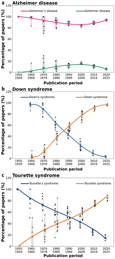 Fig. 1. Trajectories of possessive and non-possessive disease eponyms in the biomedical literature. a. Alzheimer disease. b. Down syndrome. c. Tourette syndrome. For each condition, the proportion of PubMed-indexed English-language article titles using the possessive versus the non-possessive eponym is shown by decade (1950–2025). Historical or biographic articles were excluded. Individual points represent yearly values; shaded violins illustrate the distribution within each decade; diamonds indicate decade means; solid curves show smoothed trajectories fitted to the decade means. Colors distinguish possessive and non-possessive forms. Data were generated using a Python script executed on the Google Colab platform. The figure illustrates the evolving balance between possessive and non-possessive disease eponyms across conditions over time. Today, the non-possessive form "Down syndrome" is used almost exclusively. The shift from "Down's syndrome" to "Down syndrome" likely reflects the early influence of human genetics in this field. After Lejeune, Gautier, and Turpin identified trisomy 21 as the chromosomal cause of the condition in 1959 [11], the disorder acquired a precise biological definition that favored a descriptive rather than a possessive eponym. As a second comparison, we analyzed Tourette syndrome [12]. Unlike Down syndrome, whose terminology was influenced by the identification of a defined genetic mechanism, Tourette syndrome remains primarily a clinically defined movement disorder, lacking a comparable mechanistic framework that might drive terminological change. According to our data, earlier literature predominantly used the possessive form "Tourette's syndrome", but since the 1990s, the non-possessive form "Tourette syndrome" has become predominant (Fig. 1c). Thus, even in the absence of a clear mechanistic definition, the neurology community has progressively adopted the non-possessive form. The different trajectories observed for the possessive eponyms in Alzheimer disease, Down syndrome, and Tourette syndrome are striking and suggest that the continued use of “Alzheimer’s disease” reflects a field-specific resistance to terminological adaptation rather than a general reluctance within the neurology community to adopt modern nomenclature. Eponym heterogeneity in reviews and meta-analyses Terminological heterogeneity has direct practical consequences for literature retrieval [13]. Systematic reviews and meta-analyses rely on the exhaustive identification of all relevant studies. Because two competing terms coexist for Alzheimer disease, searches restricted to a single term risk overlooking parts of the literature. The issue is therefore not merely grammatical but methodological. We thus examined whether PubMed searches using either "Alzheimer's disease" or "Alzheimer disease" retrieve identical, overlapping, or distinct sets of records. Our results show that the retrieved records are not identical. This discrepancy is observed both in exact phrase searches (Fig. 2a) and in all fields searches (Fig. 2b). Although the two record sets overlap substantially, each retrieves sizeable unique subsets of papers. With exact phrase searches, 38.0 % of records are retrieved only with "Alzheimer's disease" and 15.5 % only with "Alzheimer disease". In contrast, when all fields are searched, the asymmetry reverses: 26.8 % of records are retrieved only with "Alzheimer disease" and 9.7 % only with "Alzheimer's disease", reflecting the normalization of indexing terminology (Fig. 2a–b). Thus, depending on the search term used, up to one third of the literature may be excluded from retrieval. By contrast, PubMed searches based on MeSH (Medical Subject Headings) rely on the controlled descriptor "Alzheimer Disease" without the possessive 's. This controlled vocabulary normalizes terminology independently of the wording used in titles or abstracts, ensuring consistent retrieval across MeSH-indexed records (Fig. 2c). These observations argue against the continued use of inconsistent terminology. The case for discouraging the term "Alzheimer's disease" is therefore not only stylistic but also epistemic; terminological inconsistency can fragment the evidence base and complicate comprehensive literature retrieval. Figure 2