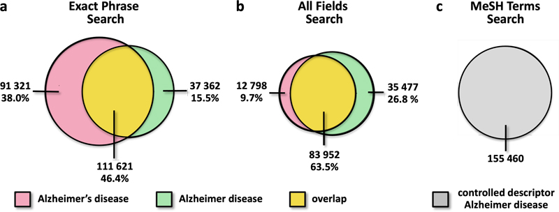 Fig. 2. Retrieval of PubMed references differs according to queries for possessive or non-possessive Alzheimer disease terms. a. Exact phrase searches for "Alzheimer's disease" and "Alzheimer disease" retrieve non-identical but partially overlapping sets of records. A large proportion of references are captured by only one search term. b. In all fields searches, the overlap between the two queries increases, but a substantial number of records is still missed by only one term, with the asymmetry now favoring the non-possessive form. Depending on the search type and term used (a–b), PubMed searches may thus miss up to 38 % of the literature, highlighting the substantial impact of terminological variation on literature retrieval. c. In contrast to free text searches, PubMed MeSH searches use the controlled descriptor Alzheimer Disease, i.e. the non-possessive form, yielding a uniform literature corpus. These analyses were performed across all article types, all languages, and all years since 1900, in contrast to the analyses presented in Fig. 1. Alzheimer eponyms, nosology, and disease mechanisms Eponyms have long been useful in identifying disease entities and distinguishing them fromothers. Yet, they are often imprecise descriptors of biology. Alois Alzheimer originally described onesingle case. Since then, the field has expanded enormously, revealing marked heterogeneity inpathology, clinical presentation, and molecular mechanisms. Some cases show prominent synuclein co-pathology, others do not. Modifier genes, epigenetic factors, and differential vulnerability of neuronal systems all contribute to a growing spectrum of disease subsets. As biomedical knowledge advances, the phrase "Alzheimer disease" itself increasingly functions less as a single sharply bounded entity than as a family of related pathological states. Parallel expressions such as "Alzheimer risk" further broaden the conceptual landscape. This explosion in mechanistic and nosological complexity highlights the limitations of inherited eponym terminology and supports the move toward more precise, standardized usage whenever possible. Conclusions Why does the terminology shift from possessive to descriptive eponyms matter? First and foremost, it is a matter of accuracy and precision. After years of working as physician-scientists, we view Alzheimer disease as a biological and pathological entity; it is not something owned by any individual. Using the non-possessive form reminds us that this is a condition, not a possession. Second, removing the possessive eponym from Alzheimer's promotes uniformity across different languages and cultures, which is crucial in our globalized world of medicine and science. Non-possessive eponyms are easier to translate and adapt internationally, helping healthcare professionals from different countries communicate more effectively [14]. In accordance with major medical authorities, including the World Health Organization, the non-possessive form is recommended. Third, scientific language evolves, and with it the standards of clarity, precision, and professionalism. Historical convention explains why the possessive form remains common in parts of the Alzheimer field. Still, comparison with Down syndrome and Tourette syndrome shows that such conventions can change, and that neurology is fully capable of adopting the non-possessive form once consensus emerges. So, the next time we write or speak about this devastating disorder, it is worth remembering that "Alzheimer disease" is not only the internationally recommended term but also the one that bestsupports clarity, precision, and comprehensive literature retrieval. Respect for history and respect for scientific rigour need not conflict. On the contrary, adopting evolving terminology standards is one way to honor both. Disclosure statement Generative artificial intelligence (AI) tools, including OpenAI’s GPT-5.3, were used to assist with code refinement, data verification, figure preparation, and limited text editing. No AI tools were used for data generation or interpretation. All content was independently reviewed and approved by the authors, who take full responsibility for the integrity and accuracy of the work. Conflict of interest statement The authors declare no conflict of interest. Funding statement The authors declare that they have not received any funding. References 1. American Medical Association. AMA Manual of Style: A Guide for Authors and Editors. 11th ed. Oxford: Oxford University Press; 2020. https://academic.oup.com/amamanualofstyle 2. World Health Organization. International Classification of Diseases 11th Revision (ICD-11). Geneva: World Health Organization; 2019. https://icd.who.int/ 3. Alzheimer A. Über eine eigenartige Erkrankung der Hirnrinde. Allgemeine Zeitschrift für Psychiatrie und psychisch-gerichtliche Medizin. 1907. 64:146–148. 4. Alzheimer A, Stelzmann RA, Schnitzlein HN, Murtagh FR. An English translation of Alzheimer’s 1907 paper, “Über eine eigenartige Erkrank-ung der Hirnrinde”. Clin Anat. 1995. 8:429–431.https://doi.org/10.1002/ca.980080505 5. Alzheimer A. Über eigenartige Krankheitsfälle des späteren Alters. Zeitschrift für die gesamte Neurologie und Psychiatrie. 1911. 4:356–385. 6. Kraepelin E. Psychiatrie: Ein Lehrbuch für Studierende und Ärzte. 8th ed. Leipzig: Barth; 1910. 7. Stewart RM. A case of Alzheimer's disease. Journal of Mental Science. 1912. 58:667–678. 8. No authors listed. Classification and nomenclature of morphological defects. The Lancet. 1975. 1(7905):513. https://doi.org/10.1016/S0140-6736(75)92847-0 9. National Institutes of Health. NIH Editorial Style Guide. Accessed March 12, 2026. https://www.nih.gov/nih-style-guide 10. Down JL. Observations on an ethnic classification of idiots. London Hospital Reports. 1866. 3:259–262. 11. Lejeune J, Gautier M, Turpin R. Étude des chromosomes somatiques de neuf enfants mongoliens. C R Acad Sci (Paris). 1959. 248:1721