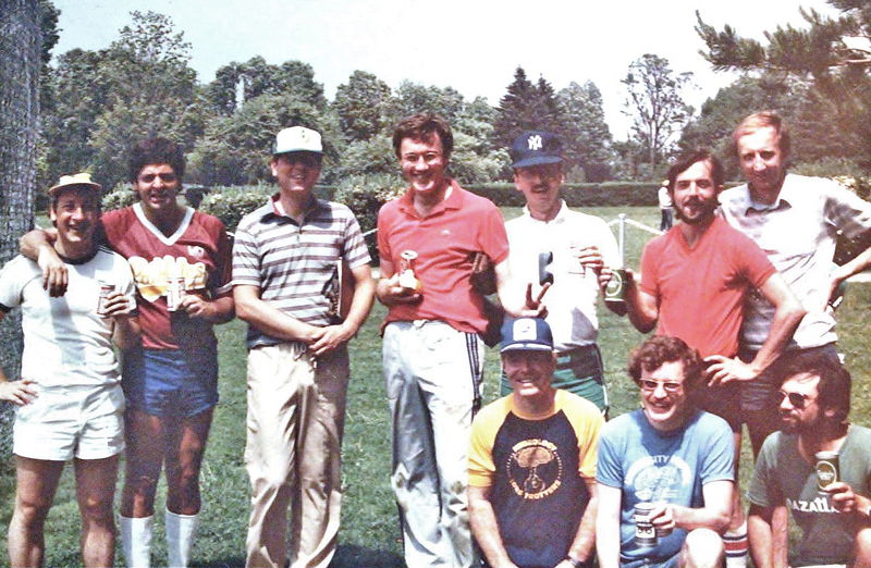 Figure 24: Neuroscience Residents v Staff Neurologists Softball Tournament, Western University 1983. Left to right standing. Peter Gates, Lee Voulters, George Ebers, John Noseworthy, Greg Cairncross, JF Lemieux, Michael Farrell. On ground, not identified at this time, Rick McLachlan and Jon Stoessl. Dabbling in Neuroimmunology When my neuropathology residency was completed, I had an opportunity to spend time in George Ebers’ (Fig. 25) neuroimmunology laboratory at Western. It was the first time I did any bench work since Minneapolis. Holly Armstrong did her best to teach me her meticulous laboratory techniques. At that time George was the world’s leading expert in multiple sclerosis (MS) genetics and epidemiology. A brilliant Columbia educated neurologist-scientist George was bursting with ideas and enthusiasm. He was responsible for helping many young Canadian neurology residents to have outstanding careers in MS research, most notably George Rice, John Noseworthy and Brian Weinshenker. I was tasked to correlate MS plaque morphology with the presence or absence of oligoclonal bands (OBs) [8]. Along the way I learned the techniques involved in CSF analysis for OBs and later with Holly’s invaluable help, I introduced the technique to the Richmond Hospital in Dublin.