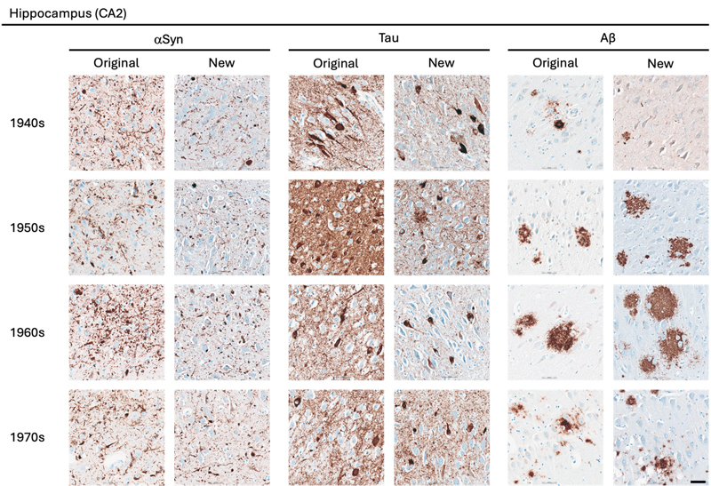 Representative images of immunohistochemical stains of CA2 of the hippocampus for originally paraffin-embedded blocks (Original) and for newly paraffin-embedded blocks upon prolonged fixation (New). αSyn Photomicrographs comparing 5G4 IHC staining seen in same case per decade. Tau Photomicrographs comparing AT8 IHC staining seen in same case per decade. Note that intense staining represents specific tau staining. Aβ Photomicrographs comparing 4G8 IHC staining seen in same case per decade. Scale bar = 50 μm. Abbreviations: αSyn, alpha-synuclein; Aβ, amyloid-beta. Figure 2