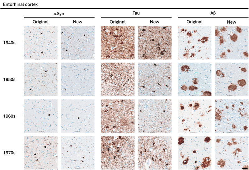 Representative images of immunohistochemical stains of entorhinal cortex for originally paraffin-embedded blocks (Original) and for newly paraffin-embedded blocks upon prolonged fixation (New). αSyn Photomicrographs comparing 5G4 IHC staining seen in same case per decade. Tau Photomicrographs comparing AT8 IHC staining seen in same case per decade. Aβ Photomicrographs comparing 4G8 IHC staining seen in same case per decade. Scale bar = 50 μm. Abbreviations: αSyn, alpha-synuclein; Aβ, amyloid-beta. Figure 3