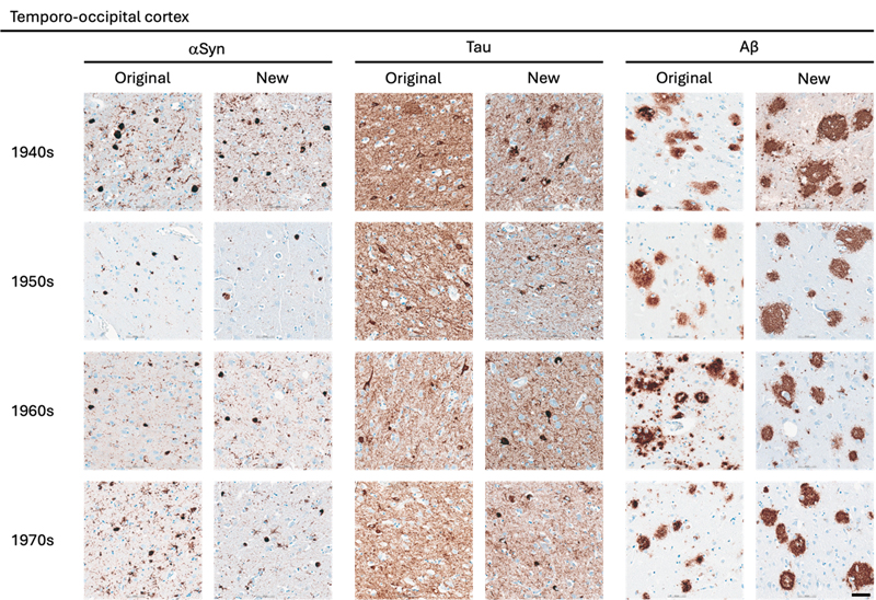 Statistical Analysis The statistical analyses were performed using GraphPad Prism version 10.6.1 for macOS, GraphPad Software, Boston, Massachusetts USA. The comparison of semi-quantitative assessments of the two types of preserved tissue was estimated applying the nonparametric Wilcoxon rank-sum test. P values are shown in tables by asterisks: *, p < 0.05; **, p < 0.01. Results A total of 162 paraffin-embedded blocks were included, 394 IHC stains were performed and 944 regions were semi-quantitatively assessed. In general, good staining quality was achieved across all decades, ranging from 1946 to 1980, and across both types of tissue preservation, i.e. original blocks stored in cardboard boxes for up to 78 years and newly sampled blocks with fixation times up to 78 years. In the comparison below, the original blocks were regarded as the gold standard, and the antigenicity of new blocks was evaluated relative to that of original blocks. Representative images of the staining quality of αSyn, tau, and Aβ pathology across the decades are provided in Fig. 1–5. Figure 1
