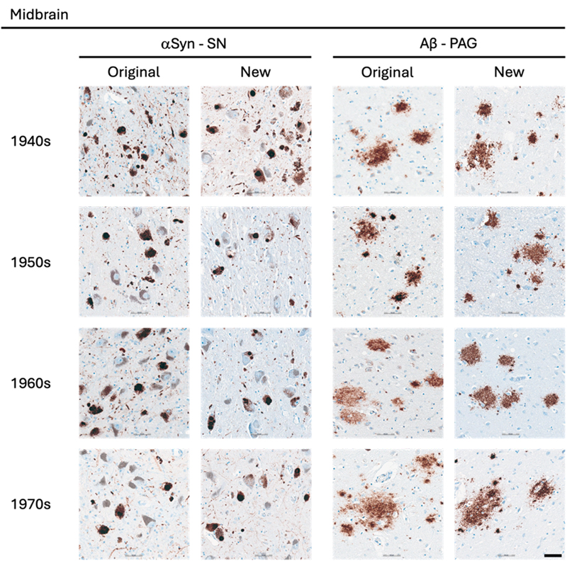 Representative images of immunohistochemical stains of midbrain for originally paraffin-embedded blocks (Original) and for newly paraffin-embedded blocks upon prolonged fixation (New). αSyn Lewy pathology labelled by 5G4 IHC in the SN across the four decades. Aβ Senile plaques detected with 4G8 IHC in original and new blocks across the decades. Scale bar = 50 μm. Abbreviations: αSyn, alpha-synuclein; Aβ, amyloid-beta; PAG, periaqueductal grey; SN, substantia nigra Figure 5