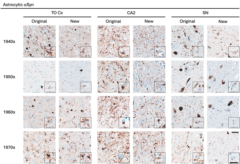 Representative images of immunohistochemical stains of astrocytic αSyn in temporo-occipital cortex, CA2 of the hippocampus and substantia nigra for originally paraffin-embedded blocks (Original) and for newly paraffin-embedded blocks upon prolonged fixation (New). Inserts show magnification of astrocytes containing αSyn labelled with the 5G4 antibody. Scale bars = 50 μm and 20 μm for inserts. Abbreviations: αSyn, alpha-synuclein; SN, substantia nigra; TO Cx, temporo-occipital cortex. αSyn The 5G4 antibody labelled both LBs and LNs with good staining quality and intensity in the original blocks. Comparable results were obtained in the new blocks with long fixation times (Fig. 1–4). Numerically, the new blocks showed slightly lower semi-quantitative scores than the original blocks, but no statistically significant differences were observed in any region (Table 5). Astrocytic αSyn aggregates were generally adequately labelled (Fig. 5) and these also showed slightly lower numerical scores on average across most regions, but a statistically significant difference was seen only in the substantia nigra of the 1960s group (p < 0.05) (Table 5).