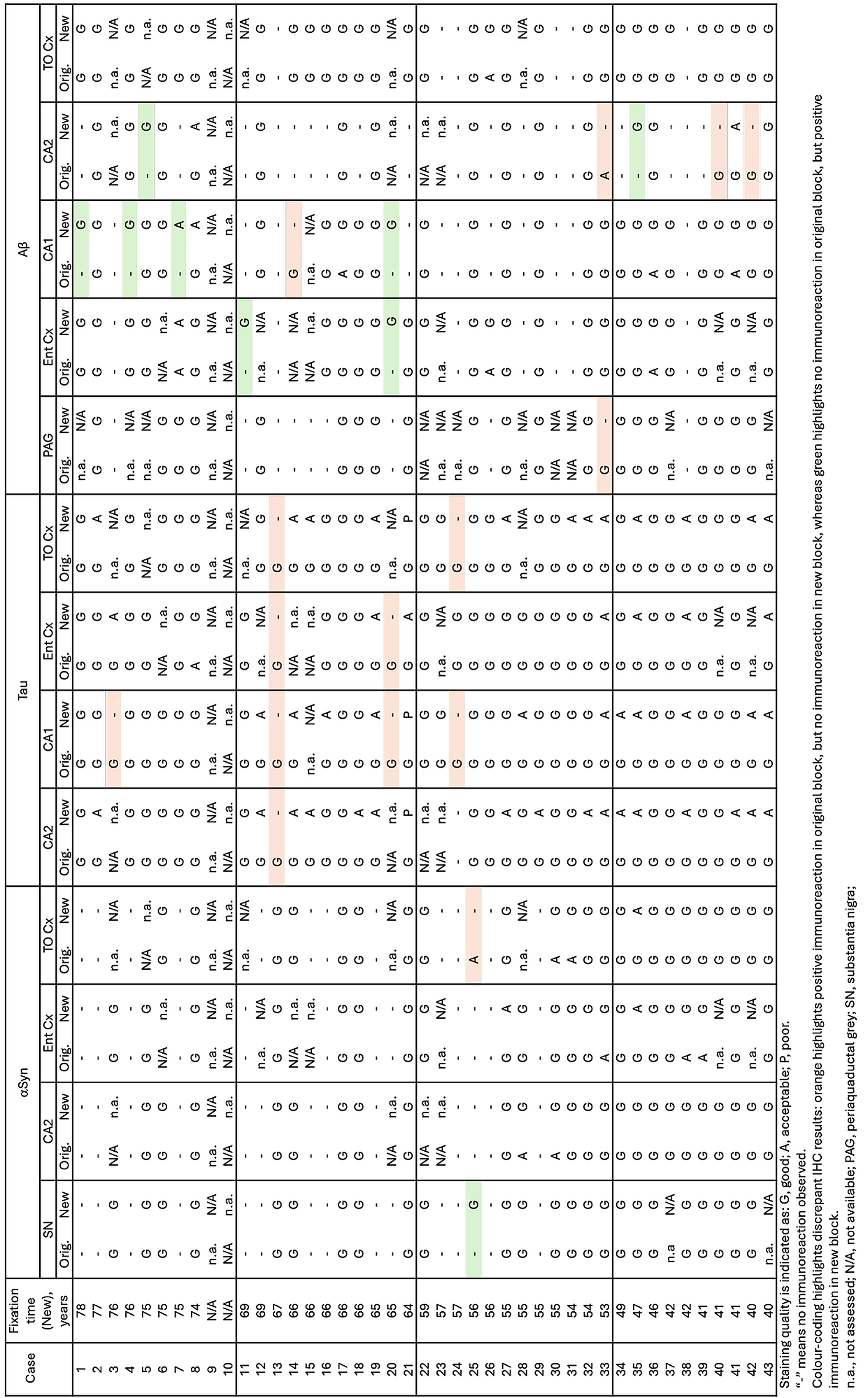 Digital assessment Whole slide scans of sections from the midbrain and hippocampal blocks including Ent Cx and TO Cx were captured on a digital slide scanner (S60, Hamamatsu, Hamamatsu City, Japan). Circular regions of interest (ROIs) of 2 mm diameter were assessed digitally at x20 magnification. The ROIs were placed at the hotspot of pathology within the assessed region. Assessment of pathology All samples were analysed by the same evaluator. The extent of αSyn, tau and Aβ pathologies were semi-quantitatively assessed at a magnification of x20 as previously described [11]. In short, intracellular inclusions (LBs and NFTs) and extracellular aggregates (SPs) were scored: 0, no lesions; 1, 1 to 5 lesions; 2, 6 to 20 lesions; 3, more than 20 lesions. The neuritic densities of LNs and NTs and astrocytic density of αSyn were assessed on a semi-quantitative scale of 0–3: 0, absent; 1, occasional; 2, moderate; 3, severe. Briefly, occasionally present meant LNs/NTs/astrocytic αSyn had to be sought out. Densities were scored moderate, when they were readily seen. Lastly, densities were rated severe when numerous LNs/NTs/αSyn-positive astrocytes were present. The presence or absence of cerebral amyloid angiopathy (CAA) was noted. Staining quality was estimated on a 3-step scale (good, acceptable, or poor). Briefly, the staining quality was assessed as good when the pathological structures were clearly labelled with no or very faint background stain. The staining was acceptable when structures were partially labelled but still detectable or were well-labelled but showed some background staining. The staining was assessed as poor if labelling was faint or the region showed excessive background staining. Table 4 summarises the assessment of staining quality. Table 4: Staining Quality of Immunohistochemical Stains